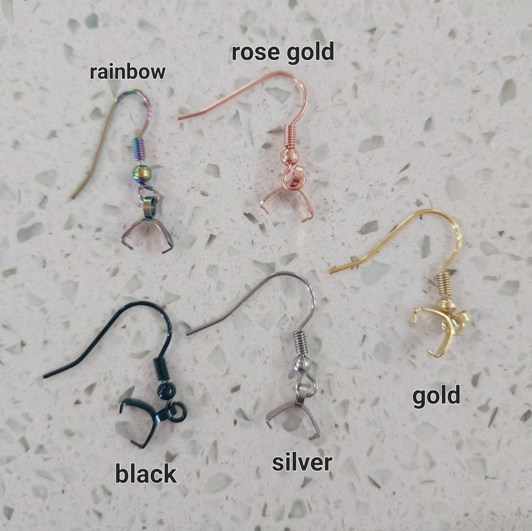 Earrings are finished off with a stainless steel hook in your color choice.  Please see listing photos for color choices and description of material from manufacturer's website. You will need to add a note at checkout of your hook color preference or message/email me shortly after. If you do not choose a color, silver will be automatically given to you. If you prefer the earring with no hooks, I will issue a $1 off each earring refund.