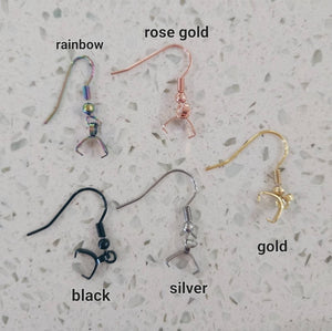 Earrings are finished off with a stainless steel hook in your color choice.  Please see listing photos for color choices and description of material from manufacturer's website. You will need to add a note at checkout of your hook color preference or message/email me shortly after. If you do not choose a color, silver will be automatically given to you. If you prefer the earring with no hooks, I will issue a $1 off each earring refund.